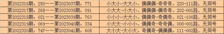 在成列三历史开奖中,第2022316期-第2022320期联贯5期奖号为:280-268-021-069-747。