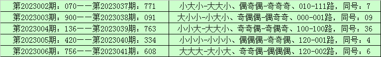 统计成列三已开出的奖号发现,在联贯5期(第2023002期-第2023006)奖号为:070-900-136-420-756。