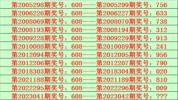 成列三第2023041期开出奖号608,该号码直选类型历史上出现了12次,前11次开出之后期下期奖号为:756、633、738、312、913、241、956、790、020、810、009,见下表: