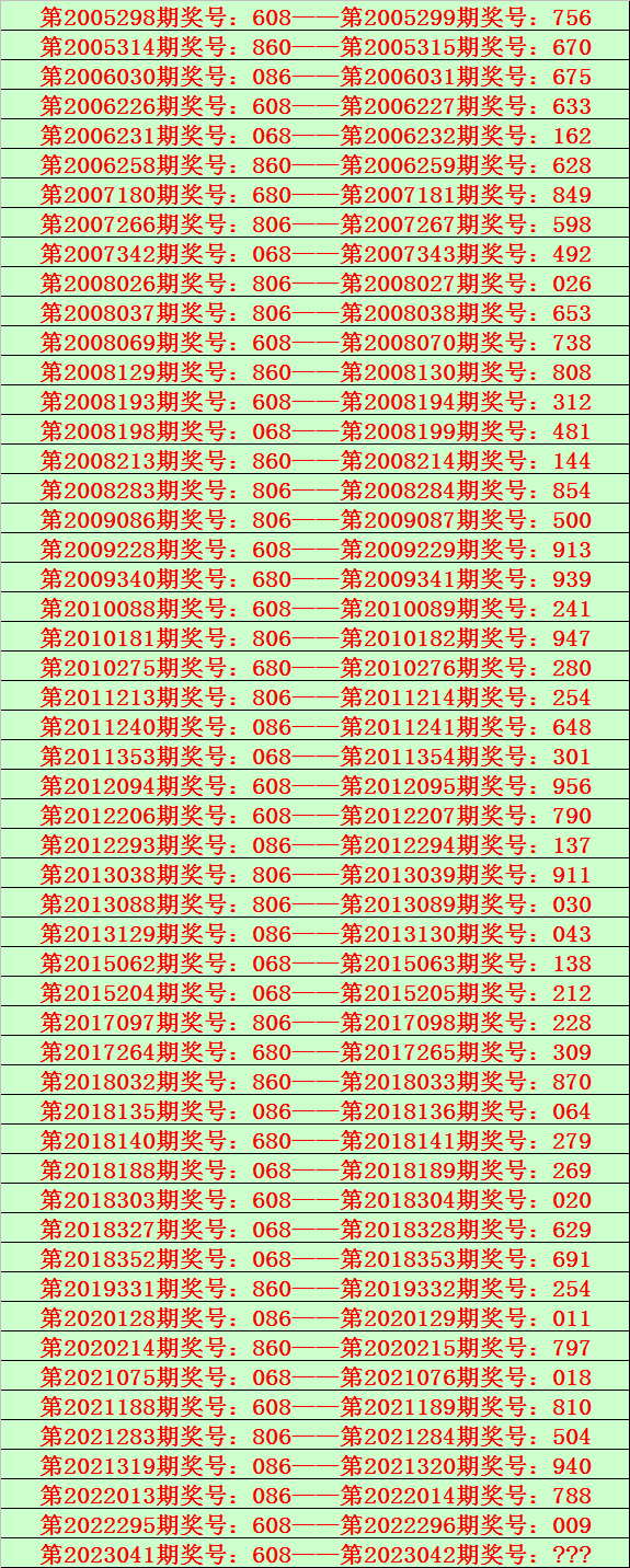 成列三第2023041期开出奖号608,该号码历史上组选出现53次,前52次开出之后期下期奖号为:756、670、675、633、162、628、849、598、492、026、653、738、808、312、481、144、854、500、913、939、241、947、280、254、648、301、956、790、137、911、030、043、138、212、228、309、870、064、279、269、020、629、691、254、011、797、018、810、504、940、788、009,详见下表:
