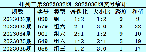 组选类型判断:最近5期陈列三开出3次组六号码,本期要点存眷组六号码出现。