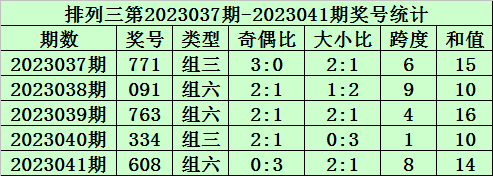 上期归来:陈列三第2023041期开奖号码为608。奖号类型为组六,奇偶比为0:3,大小比为2:1,跨度为8,和值为14。